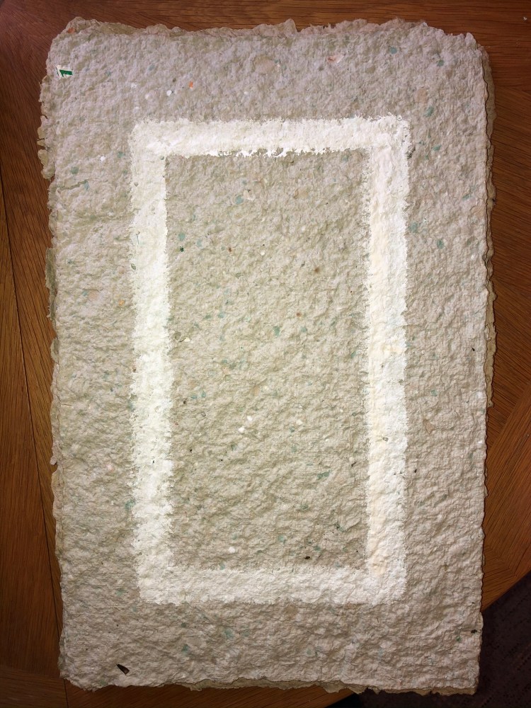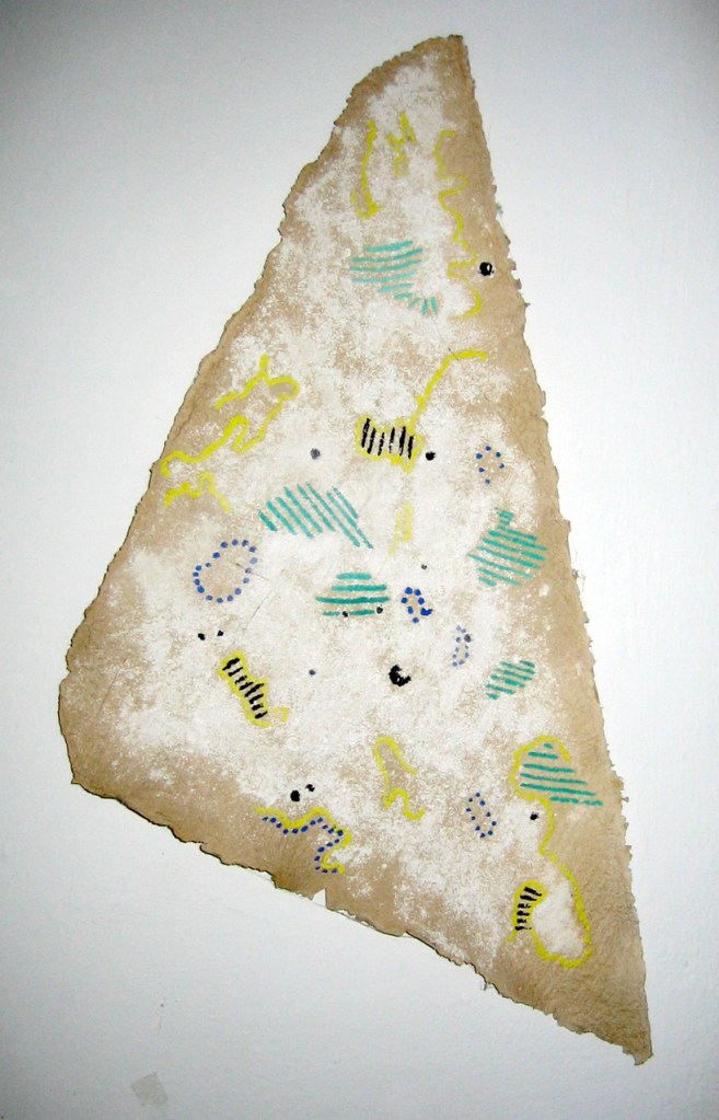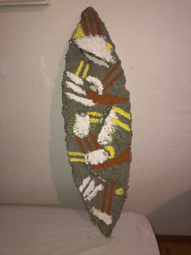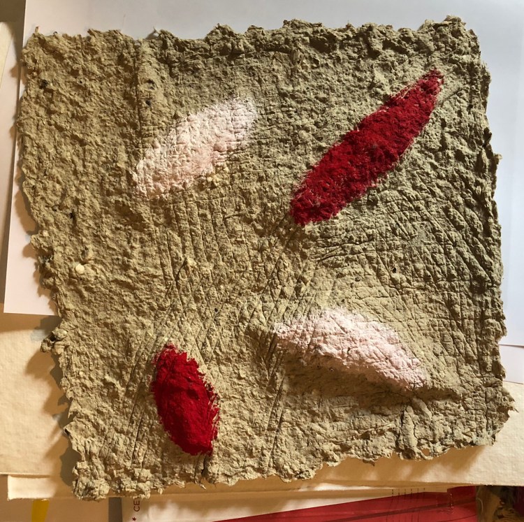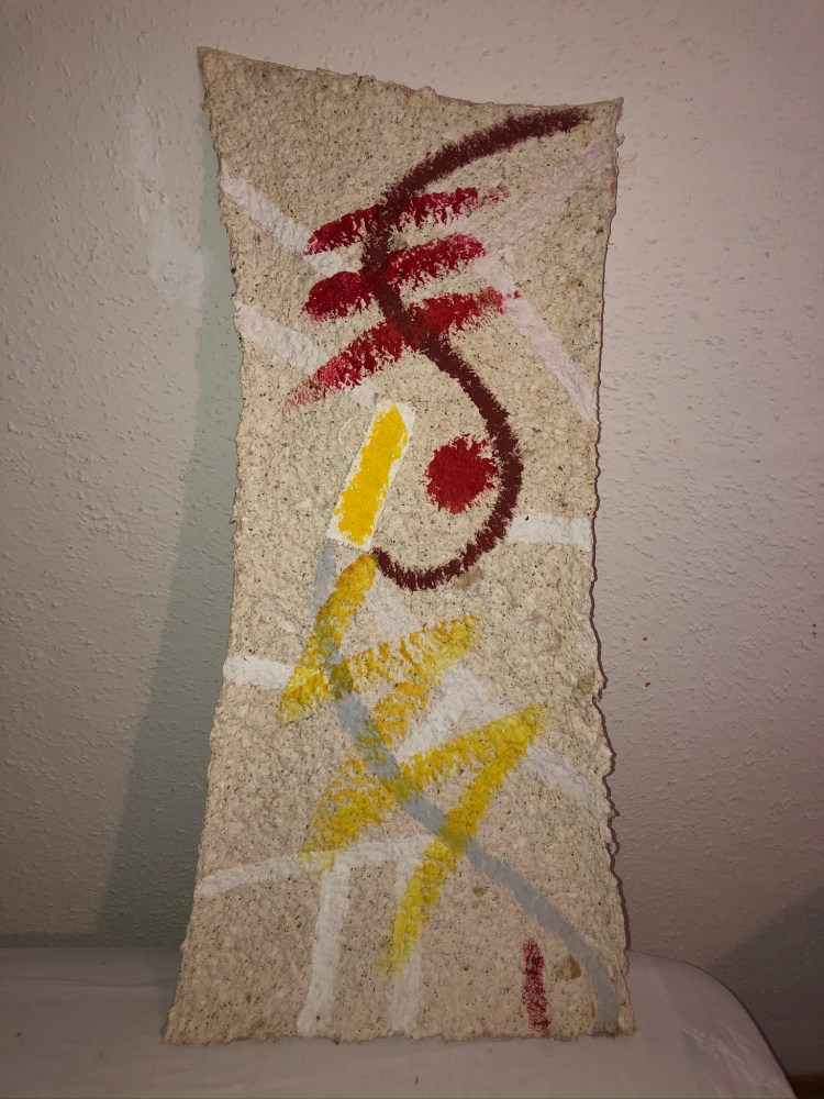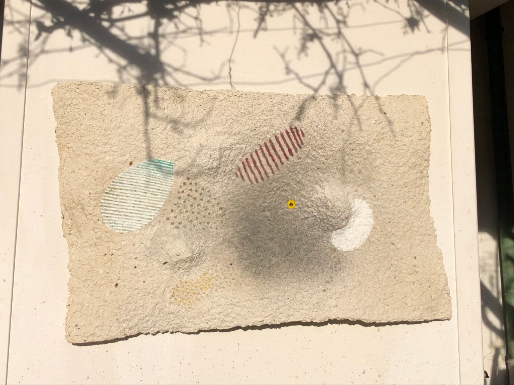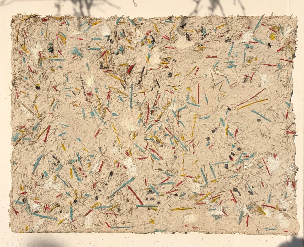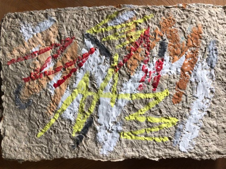 - Die Strukturen des Materials werden dabei formbildend herausgearbeitet und ergeben ein Relief. Entscheidend für diesen Prozess ist das Trocknen der Pulpe an Luft und Sonne. Die Mischung der Materialien sind jahrzehntelange Erfahrungswerte.