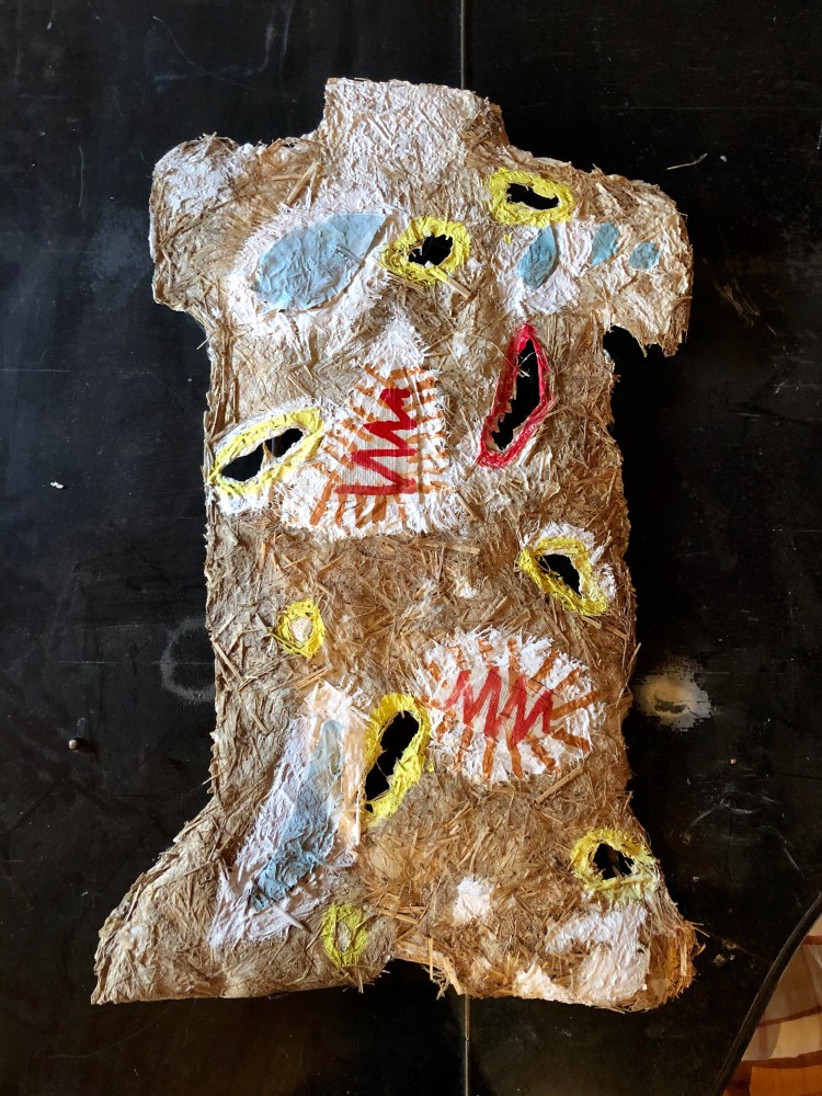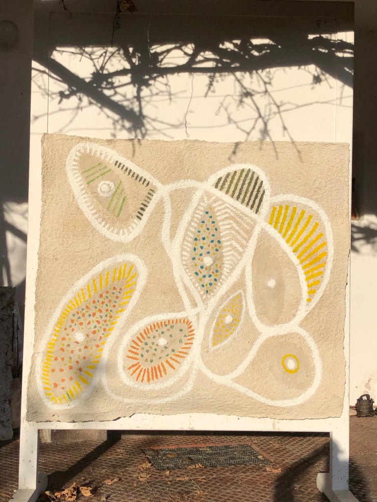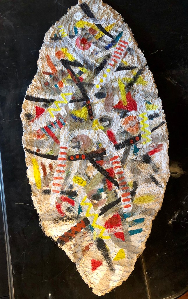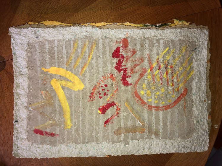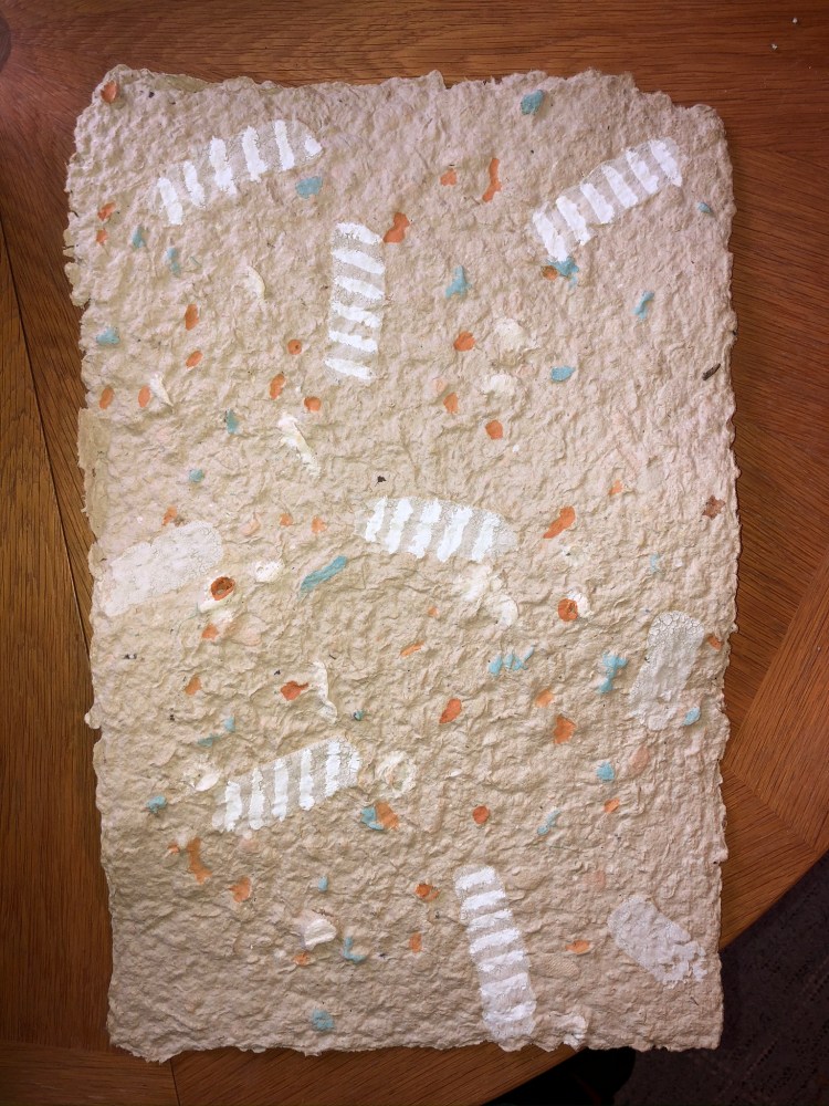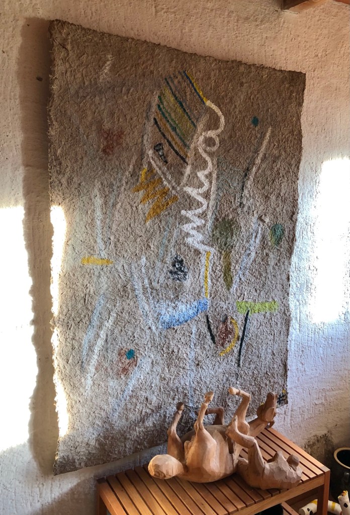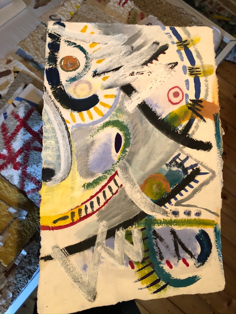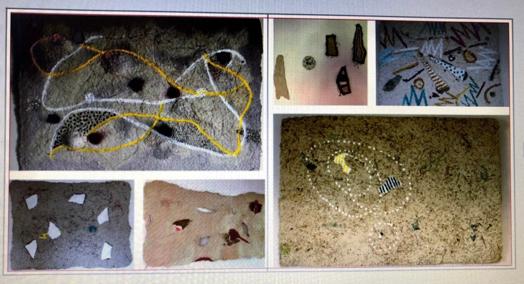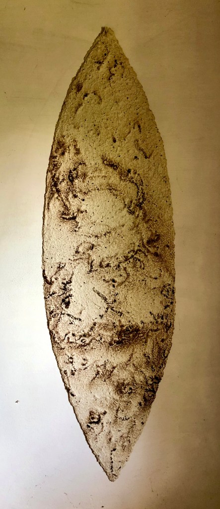 - Die Strukturen des Materials werden dabei formbildend herausgearbeitet und ergeben ein Relief. Entscheidend für diesen Prozess ist das Trocknen der Pulpe an Luft und Sonne. Die Mischung der Materialien sind jahrzehntelange Erfahrungswerte.