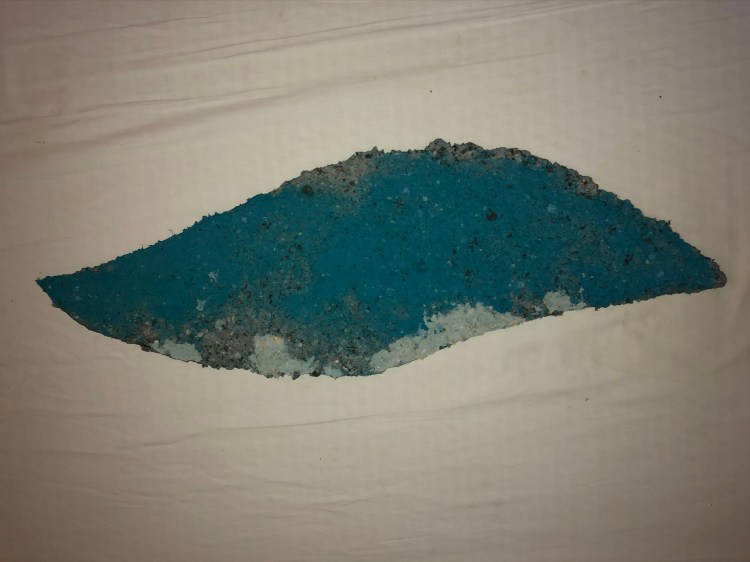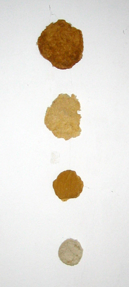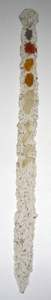 - Die Form des Objektes ergibt sich wiederum sehr stark aus der Zusammensetzung der Pulpe. Ist die Pulpe breiig und nicht mit größeren Materialteilen durchsetzt, fließt sie gleichmäßig aus und ergibt eine ovale bis runde Form. Sobald sich größere Materialteile mit in der Pulpe befinden, fließt diese ungleichmäßig aus und trocknet auch so.
