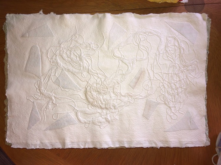 - Das getrocknete Objekt/Bild wird nun mit einem Rutengerüst aus Zweigen mit 8 bis 12 mm Durchmesser punktuell fixiert. Dadurch wird das Bild gespannt und bekommt so eine Armierung. Gleichzeitig lässt es das Papier beweglich bleiben, da es nur an wenigen wichtigen Punkten angeleimt wird und somit Feuchtigkeit aufnehmen und je nach Spannung sich glätten oder wellen. Das getrocknete Objekt verändert auch je nach Luftfeuchtigkeit unmerklich seine Außen- und Innenform.